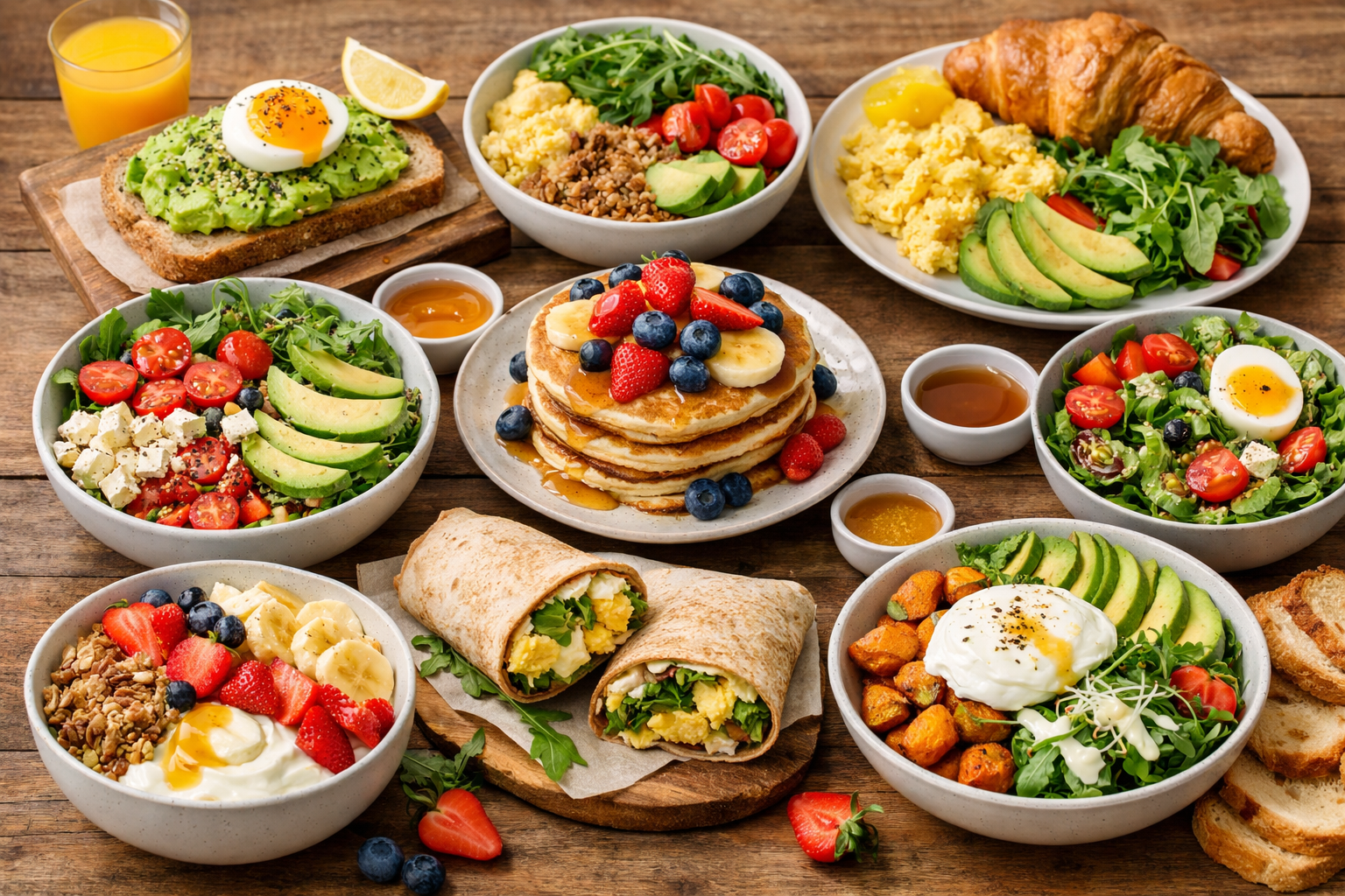 Découvrez le brunch gourmand de Just Salad : œufs, pancakes, salades fraîches, viennoiseries et boissons.